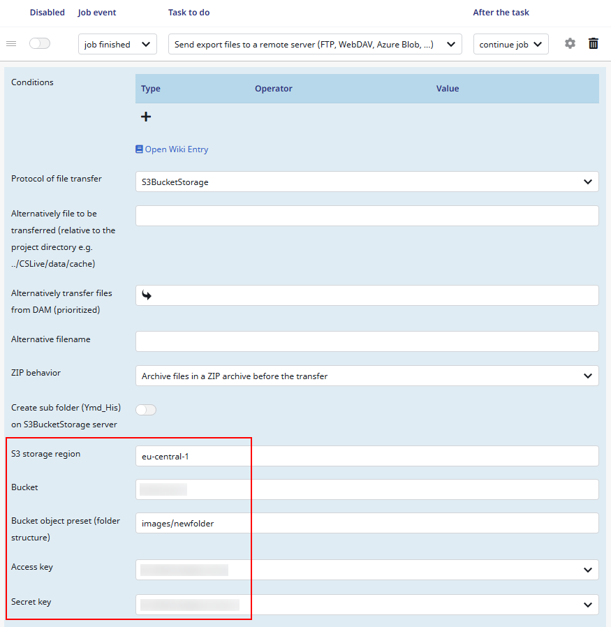 To transfer the data to a S3 Bucket Storage, you need to specify the storage region, bucket, object preset (if you like to create a folder structure) and your credentials.