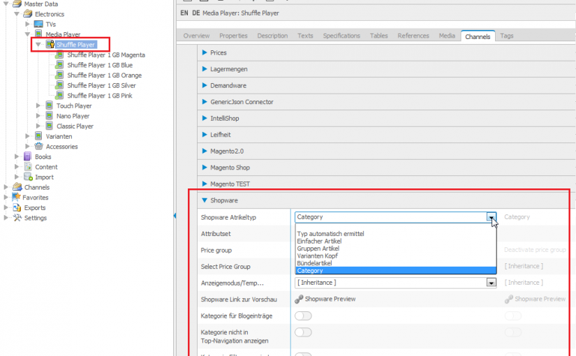 Die Datenpflege für jeden Subshop und Sprachshop geschieht an zentraler Stelle in der PIM. Für jeden Sub-Shop (DE, EN, FR) wird ein eigener View-Baum angelegt.