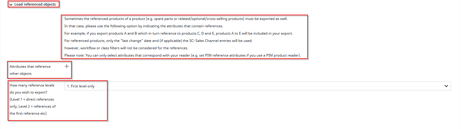“How many reference levels do you wish to export?” defines how many levels of referenced attributes will be included in the export. For example, if a variant DAM File also references another DAM File, you can specify here how many levels deep the reader should go. The reference from your product itself counts as level 1, and any further references increase the level accordingly.