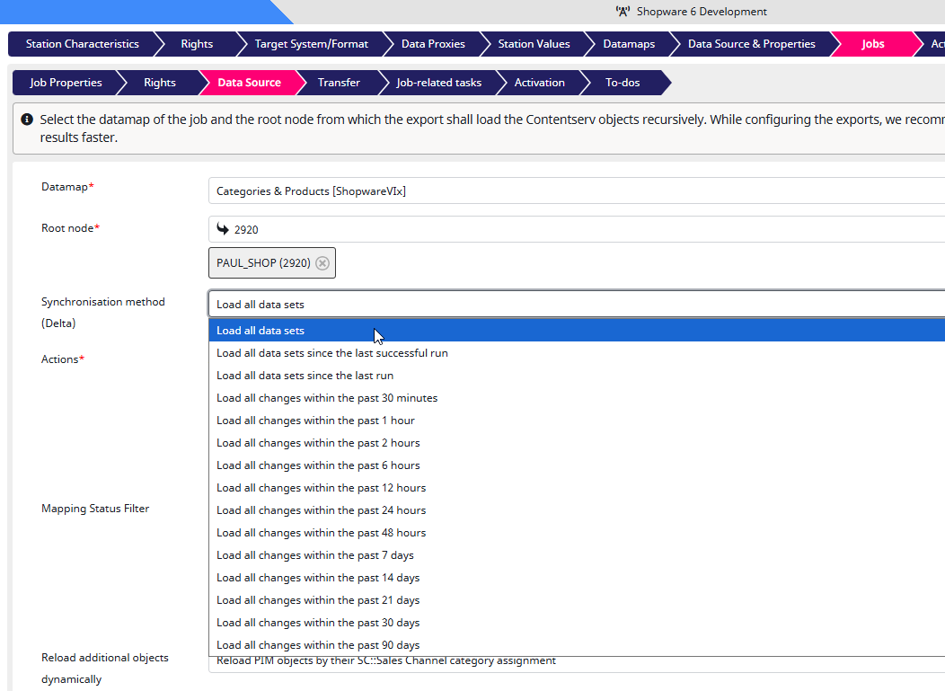 The screenshot shows delta option in the job. The most commonly used options are Load all data sets since the last run and Load all data sets since the last successful run. The second option requires daily oversight to check for export errors, since the delta (all exported differences) will grow larger as long as the error occurs while the job is running, because products are being changed yet the delta comparison date is not being set while the job is running erroneously.