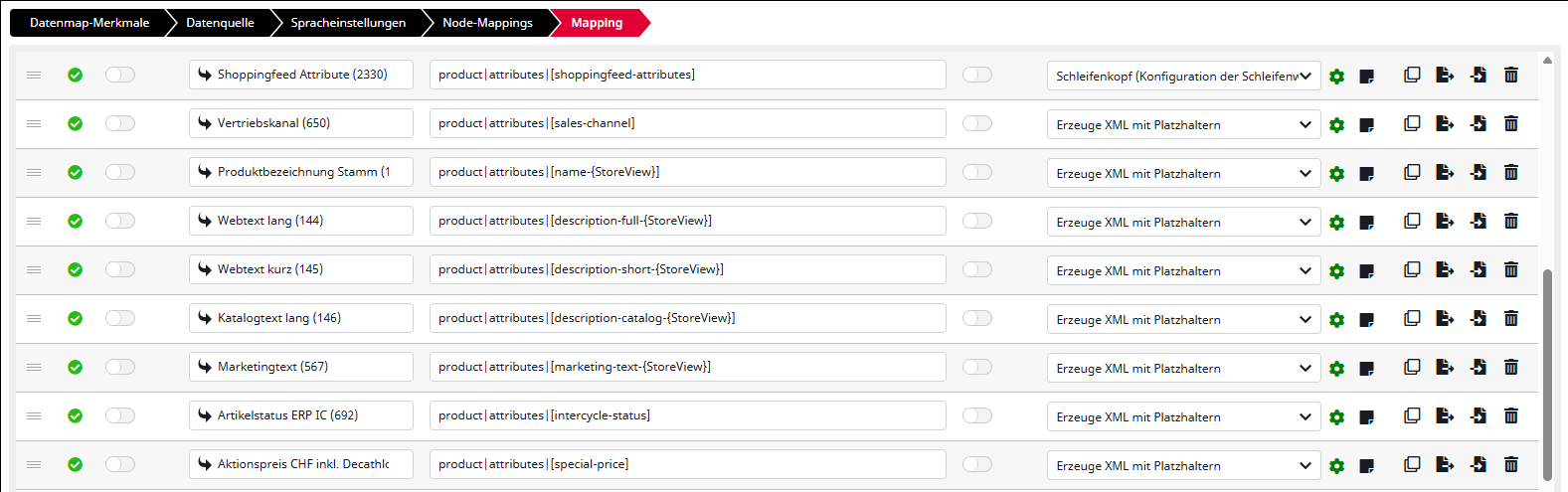 In this example, “product|attributes|[shoppingfeed-attributes]” creates a big list of attributes with sub-XMLs specifying each attribute. This list needed to be expanded by other configurations, hence the square brackets were used here to signal these multiple value groups to the connector.